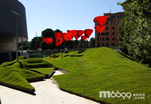 WHATAMI是一個人造列島山,這項亭子建造在較小綠色空間之中,為博物館室外增添美感。WHATAMI是“What am I”的變體,這個小山是一個花園,為博物館的外部的混凝土空間增添抹綠色。該花園可以充當音樂會的舞臺,也可以當作一個休息區(qū)域,或者是一個觀賞博物館的地方。此外,巨大的“花朵”點綴著這片綠色的人造景觀之中,為該區(qū)域提供照明,陰涼處和聲音。