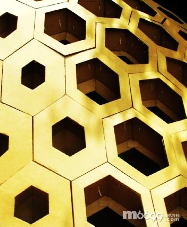 HEXigloo是多空結(jié)構(gòu)亭子的代表,使用了圓柱表面建筑技巧。從最初的設(shè)計到最后的成品,該過程經(jīng)過以下幾個步驟:在預(yù)先做好的模板表面畫出一個亭子結(jié)構(gòu),為了將兩個部分的表面結(jié)合起來,要在Z軸上勾勒出一個六邊形。所有連接起來的表面都增加了整體結(jié)構(gòu)的硬度。