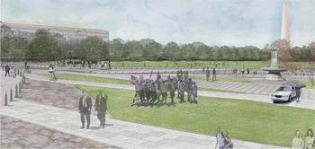 E街和南總統公園的設計構想建立在融合的想法上,如何在保證白宮安全性的基礎上,為美國民眾創造出動態活力的景觀。景觀空間如何做到兩全其美,通過整合場地建筑與形式概念嗎?一個良好社會的標志特征是帶著過去前進。通過并行舊與新,景觀能夠繼承傳統。新的設計借鑒了唐寧循環道路形式。花邊裝飾和蜿蜒曲折的形式結構,旋轉重疊,縮小在白宮的背景中。