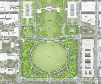 盡管橢圓草坪較好的應付四季的活動,但是日復一日如此下去,游覽者可能會感覺52公頃的草地不再受歡迎。在 L’Enfant的想象中,這里是一個連接白宮和紀念核心的重要橋梁,今天的南總統花園缺少的是適合的人的尺度。這項計劃可以活化橢圓結構,靈感來自于安德魯.杰克遜.唐寧1851年的“榆樹蔭道、車輛道、蔭蔽小樹林的行人道系統以及有此環繞的大圓形開放空間”。橢圓形的四個角都有入口,通向新的道路系統,路邊種滿了樹木,低矮草叢,大量的座椅和其他景觀加強了橢圓草坪與白宮和國家紀念碑的連接性。