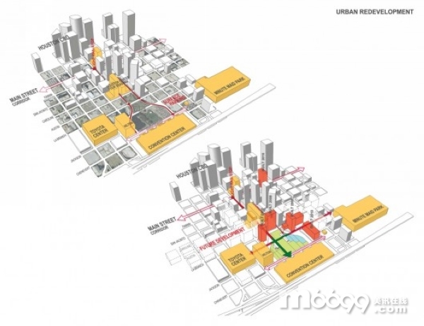 The park is organized around the structure of two dynamically juxtaposed cross axes, inherent within the existing site. The Crawford Promenade, a previous street vacated to consolidate park land, serves as the park’s central activity spine and armature of all major park spaces. This linear plaza, shaded by large Mexican Sycamore trees and defined by iconic paving and lighting, supports farmers markets, art fairs and parades, while linking the central activity of the park to major sporting venues to the north and south. The perpendicular Oak Allee celebrates a corridor of 100 year-old heritage oaks, re-creating a historic east-west connection across the site, and linking the Convention Center with downtown retail and office towers.