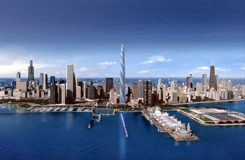 “芝加哥螺旋塔”位于密歇根湖沿岸,形似瓶塞鉆,樓高609米,150層,共1,194個豪華單元。建筑師圣地亞哥?卡拉特拉瓦以設計過眾多橋梁、飛機場和博物館而著稱,現如今,他將注意力轉移到私人豪華住宅的設計上。“芝加哥螺旋塔”屬玻璃鋼結構,具備有機線條和充滿活力的曲線,充分體現了設計師對物形態的重視。