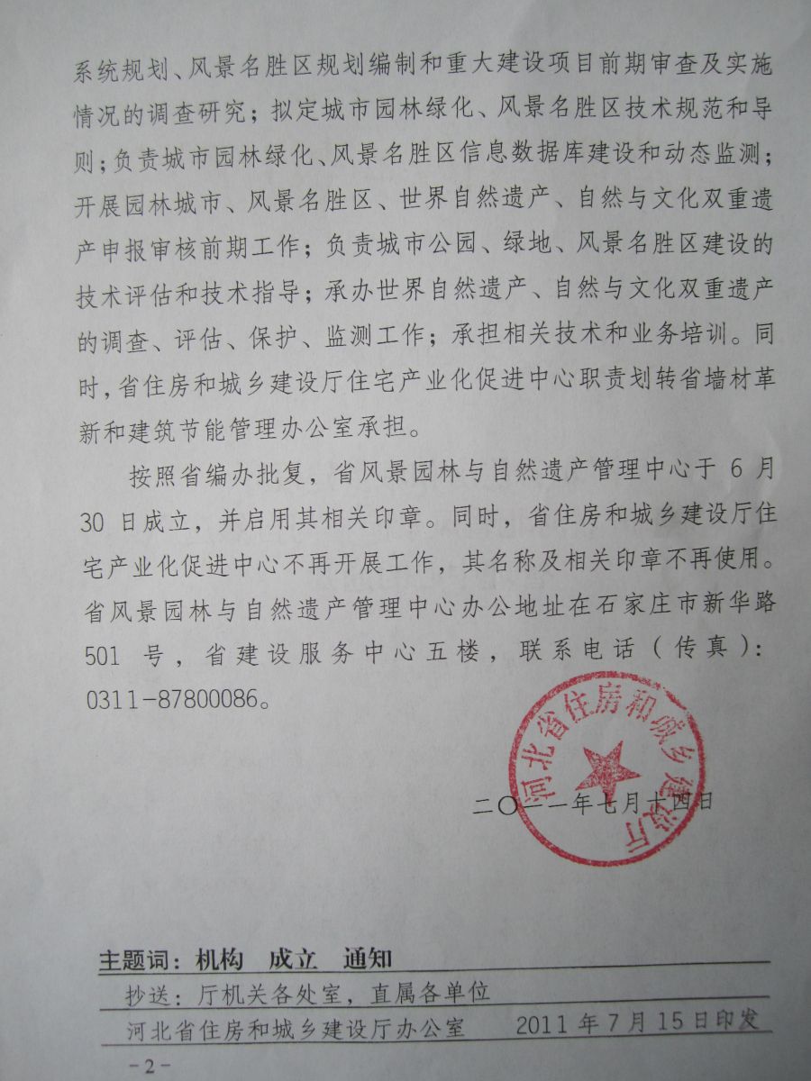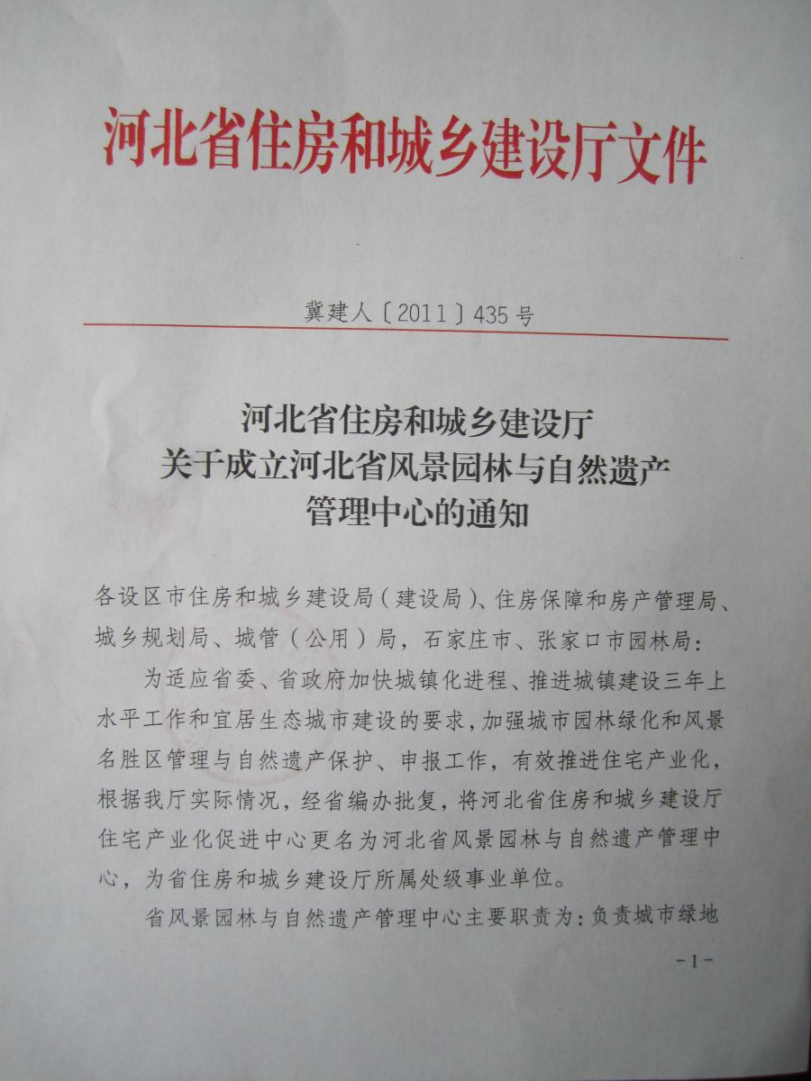 河北住建廳關于成立河北省風景園林與自然遺產管理中心的通知