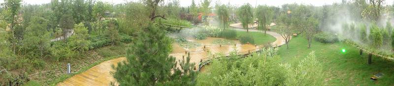 展園由一條飄逸的S形路網,將都是繁花、枯木沙丘、濕地甘泉、荒山育林四個主題景觀區域貫通,通過堆山理水的造園手法,將狹長的場地特色充分發揮,增強了景深效果,沿園路行進,景觀豐富充盈,步移景異,在園路的串接下相互聯系,啟承轉合,交相呼應,從不同的側面表達了綠色無處不在的主題。