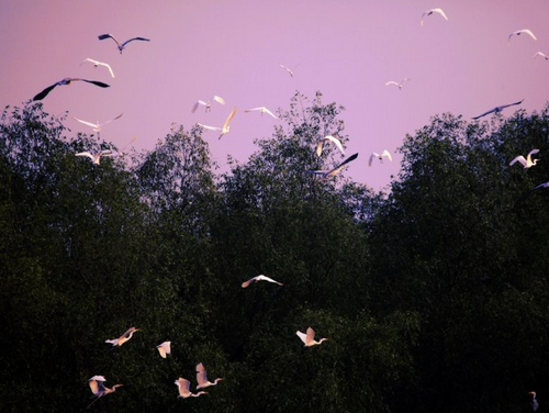 廣州南沙濕地公園地處出海口珠江西岸,保持了農耕水養的產業結構,土地原始狀態良好。在游覽核心區種植有成片的10多個品種的紅樹林、蘆葦,吸引了大量鳥類在這方樂土繁衍生息,形成珠江三角州難得一見的鳥類天堂。每年冬季,成千上萬的絲光掠鳥從北方飛來越冬,有24種上萬只鳥類在此棲息覓食,其中包括非常珍稀的黑面琵鷺、白琵鷺、黑翅長腳鷸等野鴨成群、蒼鷺佇立。廣州南沙濕地公園具有眾多別具一格的景觀:以吸引多品種和多數量的飛鳥在公園內覓食、棲息、繁衍,以種植紅樹林維護生態,以種植蘆葦形成一個上千畝的蘆葦蕩,以大面積種植觀賞性荷花形成壯觀的荷景,以開挖約25公里的迂回曲折小河形成曲水迷宮。在這里游覽,可享受"曲水蘆葦蕩,鳥息紅樹林,萬頃荷色美,人鳥樂游悠"的境意。