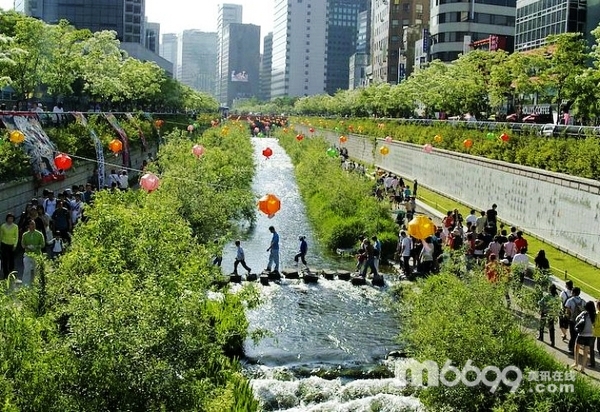 這條溪流從深埋于首爾市的地下,發(fā)現(xiàn)之后,將其改造成了一個蔥綠的公園,即清溪川河岸工程。這個長5.6千米的公園是眾多活動的聚集地,也是市民娛樂的主要場所,同時也是眾多昆蟲、魚類和野生動物的棲息地。