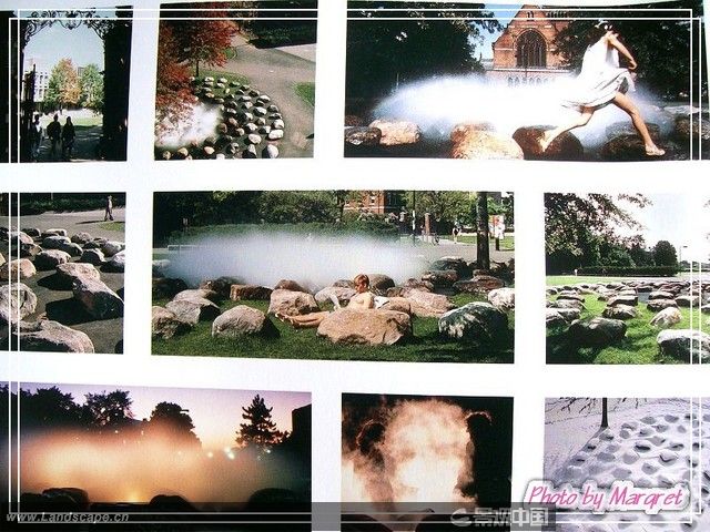 哈佛大學校園內的唐納噴泉位于一個交叉路口,是一個由159塊巨石組成的圓形石陣,所有石塊都鑲嵌于草地之中,呈不規則排列狀。石陣的中央是一座霧噴泉,噴出的水霧彌漫在石頭上,噴泉會隨著季節和時間而變化,到了冬天則由集中供熱系統提供蒸汽,人們在經過或者穿越石陣時,會有強烈的神秘感。唐納噴泉充分展示了沃克對于極簡主義手法運用的純熟。巨石陣源自他對英國遠古巨石柱陣的研究,同時質樸的巨石與周圍古典建筑風格完全協調,而圓形的布置方式則暗示著石陣與周圍環境的聯系。與其原型:安德魯的雕塑作品“石之原野”比起來,這件作品從內容和功能上都已經超越了它,唐納噴泉也因此被看做是沃克的一件典型的極簡主義園林作品。