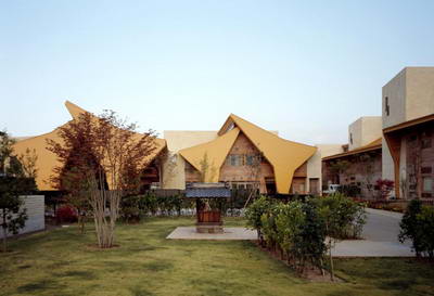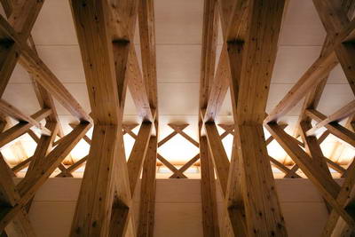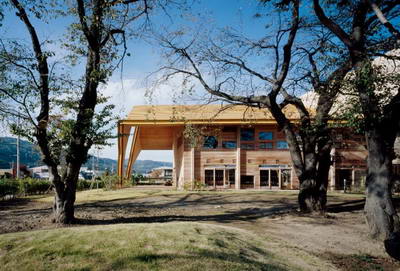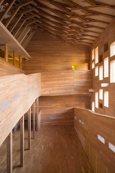 由日本建筑事務所atsushi kitagawara architects (AKA)設計的“稲荷山特殊教育學校”是一座面積為15000 m2的教育設施,它由一系列單獨的小體量建筑組成,位于日本長野縣的筑摩市。方案的中心概念是要設計一個類似于“城鎮”的建筑,建筑師將室外庭院,開放空間和小型菜地結合到一起,不僅滿足了校園內學生的活動同時也服務了周邊社區。這個設計采用了日本傳統的木建構技術,整座校園幾乎都是用長野縣的木材建造而成的。建筑整體形式以及屋頂被設計成了有趣的傾斜體,參觀者可以從外部清楚的辨認出這座獨特的建筑物。黃色的樹枝狀結構突出了建筑的整體構架同時也成為這一地區極其醒目的視覺標識。既沒使用金屬材料也沒使用層壓膠合板,建筑的結構部件通過室內空間的焦點處理,讓這座木結構校園變得透明。室內交織排列的木梁創造出了極具韻律感的天花板效果,這些木梁大部分是由落葉松木制作的。建筑師就地取材,并與傳統的木建筑工藝相結合,在建造過程中盡量減少能耗和CO2的排放量。