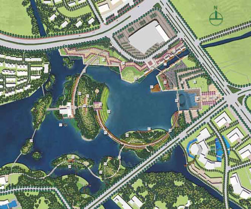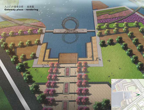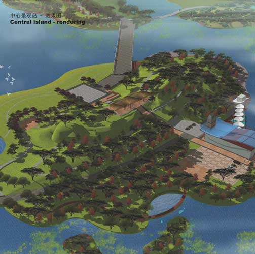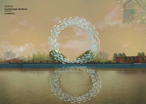 其中一個(gè)設(shè)計(jì)亮點(diǎn)是特色地標(biāo)構(gòu)筑物的設(shè)計(jì),通過(guò)用游動(dòng)的魚(yú)兒所形成的環(huán)作為造型,凸顯魚(yú)與無(wú)錫生活緊密相連的深層含義。地標(biāo)構(gòu)的設(shè)計(jì)定位是易于建造和維護(hù),具有獨(dú)特水鄉(xiāng)風(fēng)格,設(shè)計(jì)含義清晰,且晝夜具有同樣迷人的景觀效果。構(gòu)筑物的造型靈感來(lái)源于中國(guó)傳統(tǒng)園林中的月亮門(mén),構(gòu)筑物本身與其在水中倒影形成象征和諧和幸運(yùn)的數(shù)字“8”。