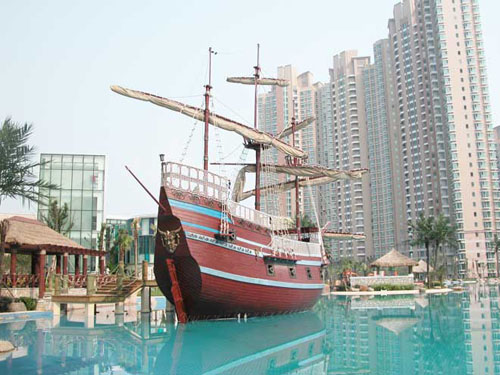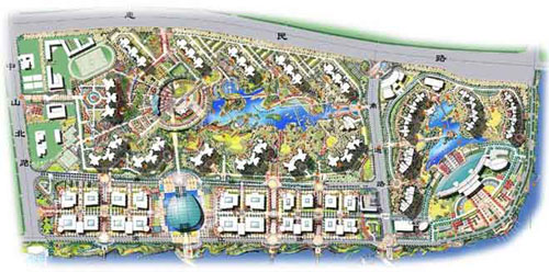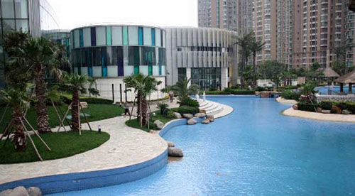 酒店主入口選用現(xiàn)代抽象的雕塑,形式和體量與酒店建筑風(fēng)格以及入口景觀(guān)設(shè)計(jì)相呼應(yīng),表現(xiàn)大氣之感,形成醒目的標(biāo)志性景觀(guān)。結(jié)合該項(xiàng)目的總體構(gòu)思,整體景觀(guān)設(shè)計(jì)由唐山路和南通路分為三大部分:濱江旅游、休閑商業(yè)街;市民廣場(chǎng)及一期庭院;二期花園居住空間。三個(gè)部分因其空間和功能結(jié)構(gòu)不同而具有不同的景觀(guān)空間,各部分又互相貫通和滲透,形成統(tǒng)一的整體。