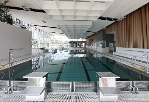 這是一座緊湊型的建筑,分成兩個不同的區域:北面的體量包括多功能室、存物柜室、技術設備室,南面的體量是游泳大廳。