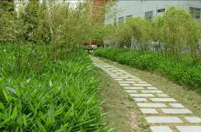 生活區(qū)中心綠地營造了濃郁、積極向上的讀書氛圍,整個綠地從俯視角度看猶如“一棵開滿花朵的桃樹”,寓意桃李滿天下,這樣的設(shè)計布局,達到了美化和功能的和諧統(tǒng)一;體現(xiàn)了校園生活文化內(nèi)涵,寓意深刻,綠地中配備了健身路、休閑椅、廣場、盆景,現(xiàn)成為學(xué)生晨讀、晚閑之用。雪松的運用就常見于中心草地,宿舍區(qū)環(huán)境幽靜,在植物常常用低矮花灌木為主,墻兩側(cè)和宿舍樓中間道路兩旁和綠地邊緣種植高大半常綠喬木,如香樟、廣玉蘭、白玉蘭、紫玉蘭、鵝掌楸、合歡等,如圖(5)、(6)。另外為增加校園的綠化效果,宿舍透視圍墻種植攀援類植物,如爬藤月季作垂直綠化;在宿舍配電房頂種植綠化,在上海高溫難耐的夏季,在室內(nèi)可以降溫,起到清涼的作用。