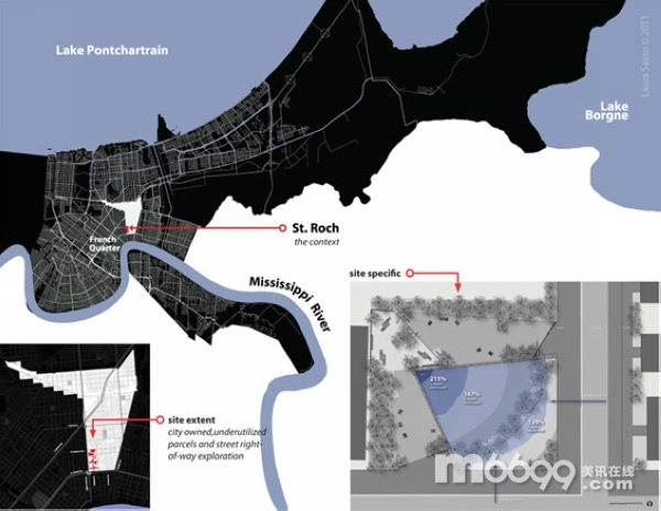 Grounded Structuration研究了一項藉以放大公共領域設計與社區政治活動的潛在關系的程序。設計探討地點的特殊價值與一些有意義的體驗在新奧爾良St. Roch社區基礎設施翻新中的可能體現方式。St. Roch以健康的守護神命名,昭示著社區幸運的開始。而諷刺的是,殘破成碎片的排水網、被污染的土壤以及飽受摧殘的土地現正威脅著曾經欣欣向榮的社區。從地面開始重塑社區形象是復興St. Roch活力的好機會。