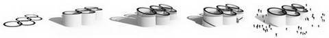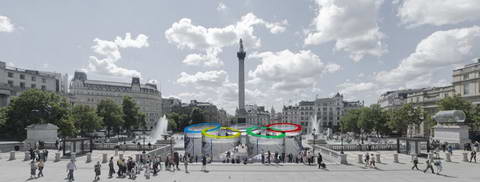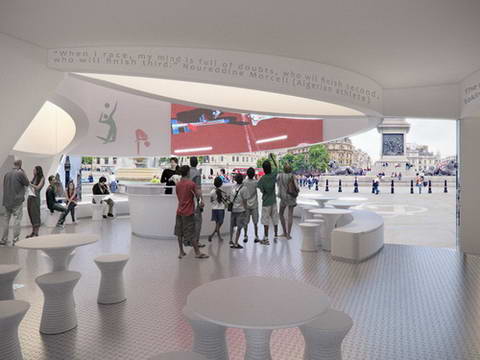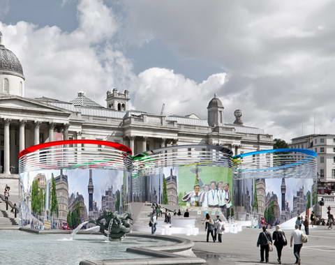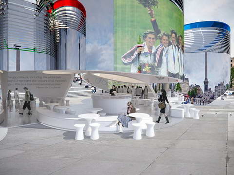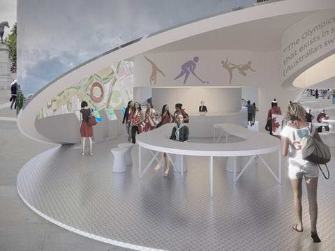 葡萄牙建筑師 jose carlos cruz、ines guedes、miguel santos和antonio cruz設計的方案贏得了[AC-CA]2012年倫敦奧運會信息館的設計競賽。這個標志性的場館位于倫敦特拉法加廣場。藍色、黃色、黑色、綠色、紅色和白色的圓環向人群傾斜,讓過往的參觀者可以看到場館內部,同時還擴展了城市公共空間。環形建筑的部分邊緣升起,讓路過的人群可以進到場館內部。參觀者可以在這個奧運五環空間中參觀、游覽,并在休息區享受周邊人流、建筑和噴泉等景色。五環建筑彎曲的鏡面表皮反射了廣場周邊的景色,為前來參觀的人群提供了一個完美的拍照背景,也為持續不斷的活動和生氣勃勃的慶典提供了非常契合的平臺。在場館內部,觸摸屏幕和互動式地圖為人們提供必要的信息,內部電力均來自屋頂上的太陽能光電板。投射在室內外墻面上的影像不斷更新,為參觀者放送精彩的視頻和節目。