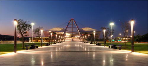 中國風景園林網訊  近日作為世界級運動場館的摩西馬比哈達體育場榮獲2011Corobrik-ILASA比賽優秀獎和總統獎。摩西馬比哈達體育場位于南非東部港市德班,由Iyer城市設計工作室設計。摩西馬比哈達體育場是為2010年世界杯而建,這里成為夸祖魯—納塔爾景觀的標志,用評審委員會的一句話說就是“這里備受推崇的原因是,設計方式的多學科性,體現了眾多城市設計理念、建筑技術和景觀表現技法,這是夢想者的作品。”