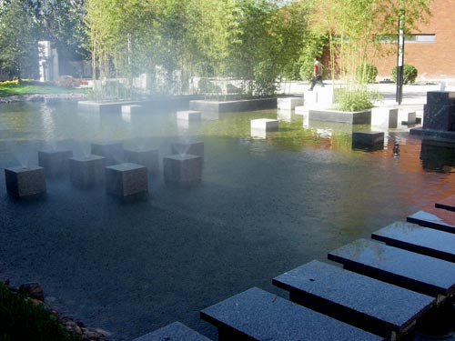 “石”的運用是本小區的另一特色,起到了點睛的作用,在小溪邊、庭院內、坡地上不同形式的景石點綴其間,與樹木相結合,構成了城市中的山林,與小區外的大環境形成了強烈的反差,使人們回到小區猶如進入世外桃源。在石材地運用上,根據不同位置分別處理:水岸邊的景石與建筑形式相呼應,采取規整的整石,并對表面進行處理,使之粗糙之中見工藝;而在庭院內、坡地上則更多運用自然山石,在庭院中形成一種中國山水的意境。