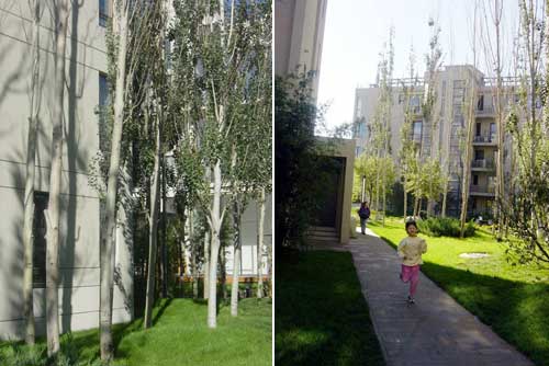 小區會所西廣場緊挨立水橋北路,較為繁華,在廣場設計時宜突出塞納維拉的特色:經典、自然,在設計時引入了林蔭廣場的概念,在廣場上陣列式種植了連排喬木(饅頭柳),樹下布置停車位,使人們在遠處看到該廣場,就能感受到赭紅色的單坡會所漂浮在大片的綠色之上,再加上會所坡頂上大片的修剪綠籬,給人留下深刻的印象。