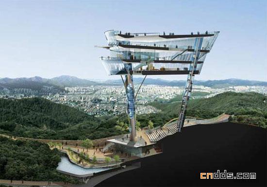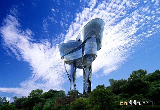 韓國Kyungam建筑師設計了位于韓國Sungnam的Daewon公園觀光塔。靈感來源于漂浮的云,因此該塔命名為“云朵360”。建筑的首層開敞,兩部主要的電梯將觀光客直接送上塔上部。餐館、咖啡廳和媒體設施均分布在云朵一樣的觀光塔的上部。
