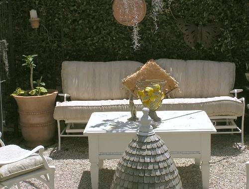 將各種有趣的家具和園林小品進行有機組合,形成了一個完美的迷人的戶外客廳。石質天井地板與白色沙發,椅子和表,西班牙苔蘚與鐵涼亭的自由混搭。容器中的檸檬則增添了新鮮的色彩和自然飛濺“熱情”。