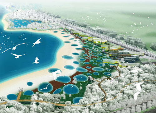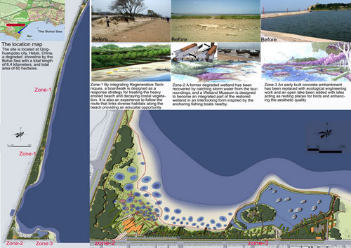項目位于河北省秦皇島市渤海海岸,長6.4km,面積為60km2。整個場地的生態環境狀況遭到了嚴重的破壞。沙灘被嚴重地侵蝕,植被退化,一片荒蕪雜亂;之前的盲目開發破壞了海邊濕地,使之滿目蒼荑。項目旨在恢復受損的自然環境,向游客和當地居民重現景觀之美,并將之前退化的海灘重塑為生態健康且風光宜人的景觀。整個場地分為三個區域: