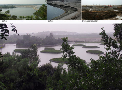 此區在項目的最東邊,之前是一個由水泥堤防構成的公園,水泥堤主要是為了保護海岸線免受侵蝕,并用圍截漲潮海水的方法來造湖。顯然這個公園既不生態也不美觀,水泥堤壩單調乏味,湖也被僵硬的水泥岸線所環繞,空曠而乏味。再生設計策略包括拆掉水泥堤岸,用環境友好的碎石取而代之;同時修建一條木棧道取代硬質鋪裝,使用當地的地被植物來綠化木棧道沿線的地面。另外,湖心建了9個綠島以豐富單調的水面,并為鳥類休憩和筑巢提供場地。