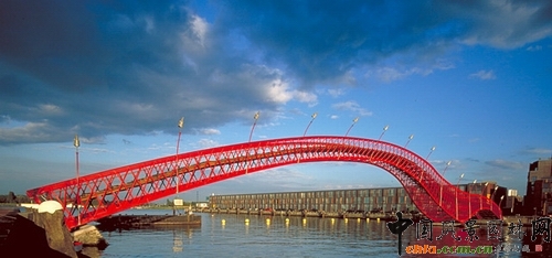 紅色曲橋位于新東埠區,她們連接著Borneo和Sporeburg兩個半島。兩座橋全以鋼制,各有特點,以鮮紅的色澤賺足了人們的眼球。她們賦予了這個港灣運動的、透視性的美感。她們既像兩姐妹競相比美,又像兩個完全獨立的個體。東邊較高的曲線橋是一座行人橋,起伏的曲線分外嬈嬌;而西邊較矮的平坦直橋則是一座供腳踏車通行的橋梁,簡潔而不失火辣。