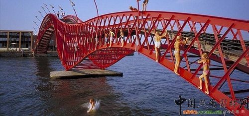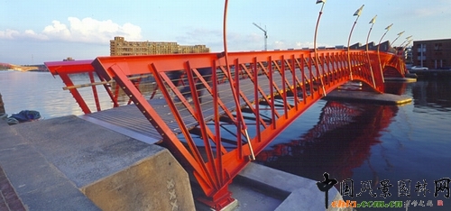 紅色曲橋以T型交錯的鋼鐵織出有著柔軟曲線的外觀,再佐以硬木鋪出起伏的通行階梯,就連橋上的路燈造型都像是辦公桌上的Memo夾,昂然有力。