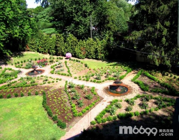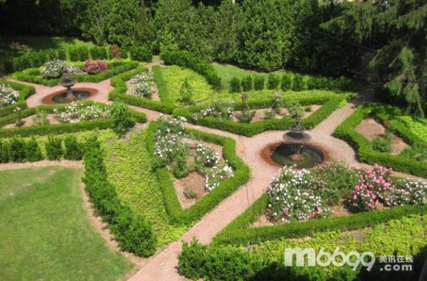 Kevin Lee Jacobs的朋友Roderic Blackburn為他構(gòu)思了這個(gè)花園的設(shè)計(jì):兩個(gè)50英尺的大圓形交叉在一起,磚石小路穿插在花園之中。兩個(gè)圓圈內(nèi)分別有四個(gè)六角形的玫瑰苗圃,苗圃邊緣種植著黃楊木。圓圈的正中間有一個(gè)三層的雕塑噴泉。