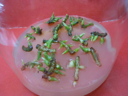 珍珠矮是典型的地生蘭,無菌播種和組織培養(yǎng)難度大。華南植物園植物種質創(chuàng)新與基因發(fā)掘領域博士生方中明在導師曾宋君副研究員、段俊研究員的指導下,以珍珠矮的種子為材料,對珍珠矮的離體快繁體系進行了系統(tǒng)的研究,獲得了從種子萌發(fā)、根狀莖增殖、根狀莖出芽分化、壯苗生根等各個階段的最佳培養(yǎng)基。經過長期研究發(fā)現(xiàn):在種子萌發(fā)階段,添加10%的椰子汁的1/2MS培養(yǎng)基有利于珍珠矮的種子萌發(fā)和原球莖增殖;在根狀莖增殖階段,添加0.5mg/L的NAA并附加1.0g/L的活性炭濃度有利于珍珠矮根狀莖的增殖;根狀莖在進行分化出芽時,添加1.0g/L的檸檬酸能顯著提高出芽率并且有效控制根狀莖及培養(yǎng)基的褐化;在壯苗生根階段,添加100g/L的香蕉汁配合10%的椰子汁能促進生根并增加苗的高度。