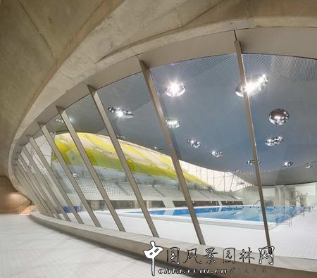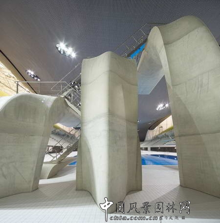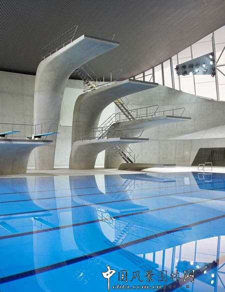 六個曲線型混凝土跳水板從大廳泳池的一端伸出,如同彎曲的舌頭一樣,彎曲的線條視覺上讓人聯想到起伏波浪,與頂上起伏的天花板交相呼應。