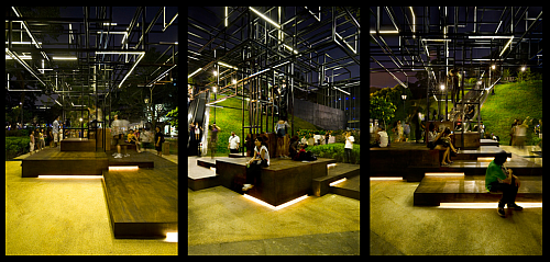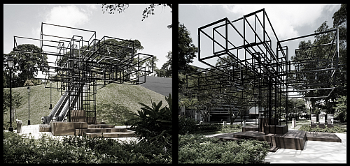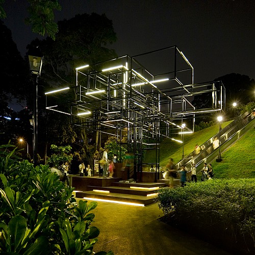 位于新加坡博物館正前方草坪上的巨大雕塑——The Tree,布滿了燈管,設計團隊FARM稱它為一棵抽象的榕樹,訴說著這個城市的歷史、故事及其魅力。