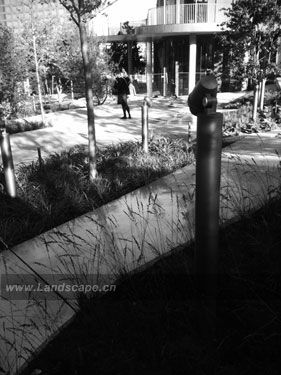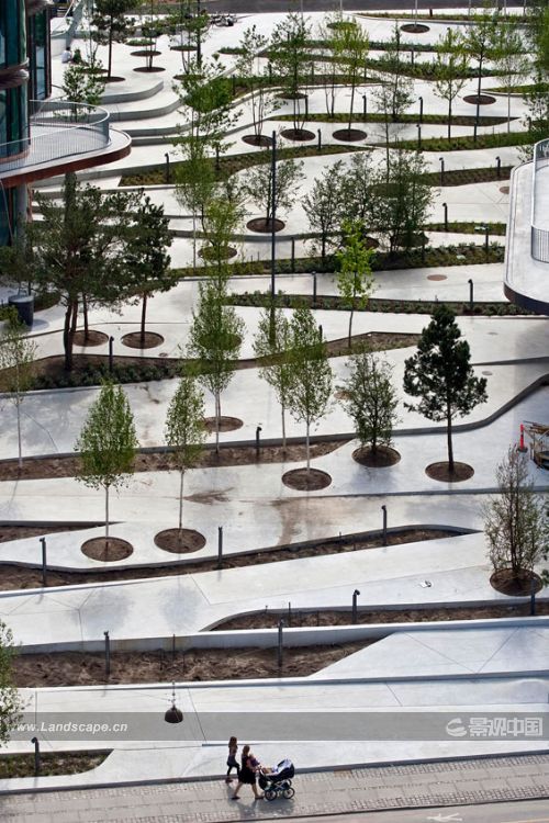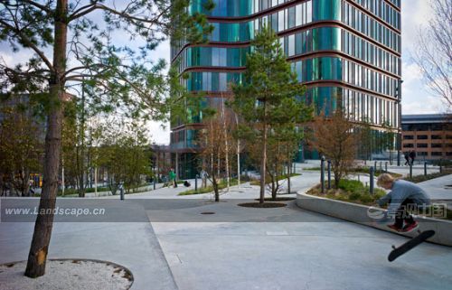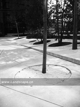 局部下陷的水平面裂縫界定了樹木和草坪的邊界線。為了達到全年水分的新陳代謝以及加強小氣候,場地上種植了落葉樹和常綠樹。樹木和林地的設計并不是為了模擬自然,而是在城市里給人一種新的看待和體驗自然的方式。這樣做的目的在于創造一種城市自然景觀,呈現自然過程,同時適宜環境并提供其他的功能。