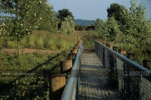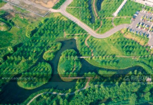 從美學的角度看,濕地有機的形狀被幾何形邊界的森林所覆蓋,森林中包括當地常綠和落葉的樹種。道路有兩種形態,一種是砂礫表面的,另一種由樹皮覆蓋,為人類活動提供了場所。一些道路的盡頭為斷頭路,阻止人類靠近生態敏感性的區域,從而保護野生動植物。兩種道路的材質都是可滲透的,能夠使地表水下滲到地下。
