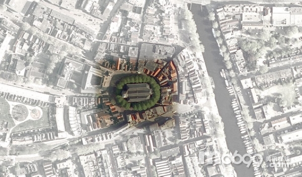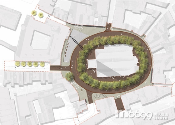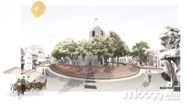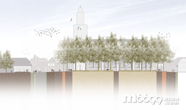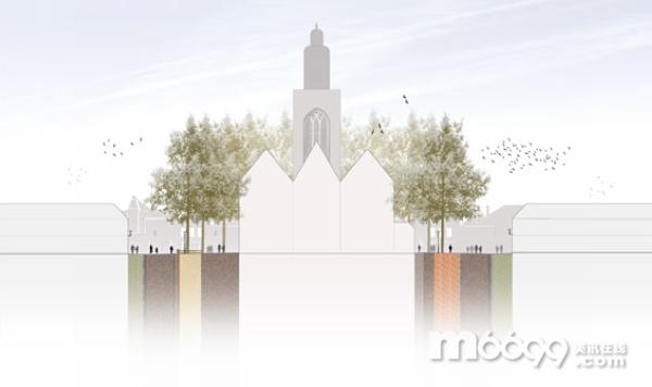 呈橢圓形三維狀分布的樹木是最為突出的空間元素,而現(xiàn)有的設計則將它變成了兩維。由紅磚鋪成的地面形成了整個廣場中性的色調,彰顯著廣場的與眾不同。教堂的周圍有一個巨大的草坪。橢圓的結構并不是一個一成不變的元素,在橢圓結構的一些點上,有眾多元素,它們暗示著通道的位置,最重要的是凸顯Geuzenmonument的位置。為了避免沖突,廣場上的紀念碑使用了本名,這樣就不會和任何的嚴格的設計元素相沖突。