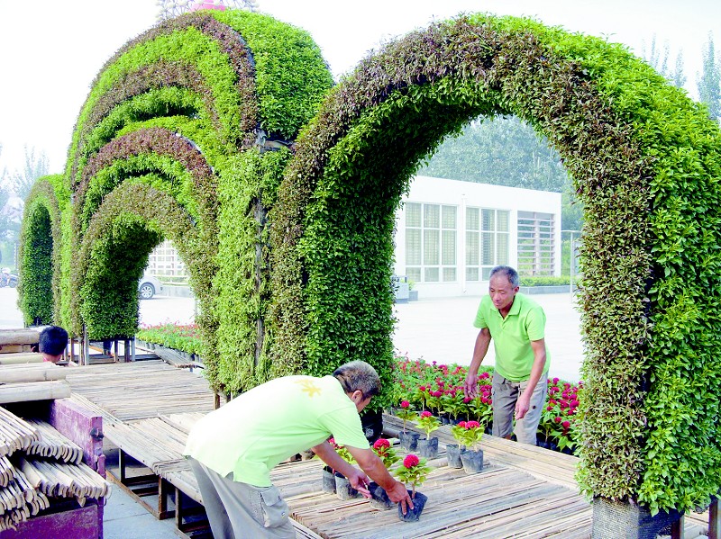8月29日,菏澤開發區園林工人在市區擺放鮮花。為迎接中秋節、國慶節及林交會,市城市管理局近日開始在市中華路、天香路和人民路等市區主要路段節點及公園門口擺放26處造型花卉,共用花卉近10萬盆(株)?;ɑ茉煨陀谢ㄋ?、轉動花架、植物雕塑、紅旗雕塑、蝴蝶雕塑、景墻雕塑等十余種。