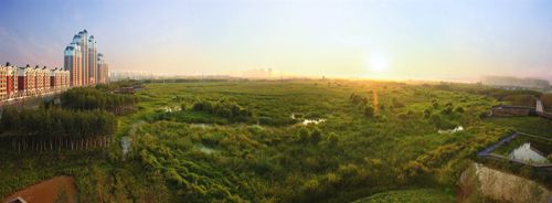 2009年中,受當地政府委托,北京土人景觀與建筑規劃設計研究院,承擔了群力新區的一個主要公園設計。公園占地34公頃,為城市的一個綠心。場地原為濕地,但由于周邊的道路建設和高密度城市的發展,導致該濕地面臨水源枯竭,濕地退化,并將消失的危險。土人的策略是將該面臨消失的濕地轉化為雨洪公園,一方面解決新區雨洪的排放和滯留,使城市免受澇災威脅,同時,利用城市雨洪,恢復濕地系統,營造出具有多種生態服務的城市生態基礎設施。實踐證明,設計獲得了巨大成功,實現了設計的意圖。