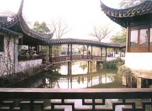 西樓小山叢桂軒為網(wǎng)師園主廳,軒的南、西為兩個小院,幽曲深閉,桂香滿庭。軒北有用黃石疊成的“云崗”。從軒西向北,可至蹈和館和濯纓水閣。水閣懸于池上,倚欄照水,但見波光瀲滟,柳暗花明。中部為主園,有池水一泓,清澈如鏡。環(huán)池建廊、軒、亭、榭,夾岸有疊石曲橋,疏密有致,配合得當。池角為園內(nèi)最小的石拱橋——引靜橋。橋面長僅212厘米,寬29.5厘米。西部為內(nèi)園,占地一畝,自成庭園。園中有屋宇、亭廊、泉石、花草,體現(xiàn)了蘇州庭園布置的精萃。濯纓水閣和看松讀畫軒隔池相望,是讀書作畫的所在;月到風來亭和射鴨廊遙遙相對,是觀魚和欣賞水中倒影的佳處。殿春簃自成院落,是主人讀書修身之處,環(huán)境幽靜,具有典型的明朝風格。網(wǎng)師園的亭臺樓榭無不面水,全園處處有水可倚,布局緊湊,以精巧見長。