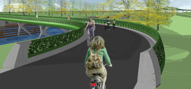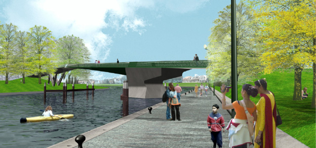 三個零散分布于道路和Noordhollandsch運河沿線的公園將被彼此相連而形成一個大型的中央園區,west8試圖設計一座跨越運河、道路及鐵路線的大橋來實現這個目標,這座大橋可供人步行、溜冰、騎自行車和慢跑,從而形成一個供市民休閑運動的好場所。與此同時,與周邊起伏變化的地形相結合也給人以美妙的的視覺享受。