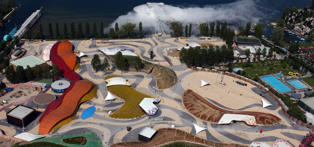 伊韋爾東萊班(Yverdon-les-Bains)的Arteplage藝術(shù)區(qū)是2002年瑞士國家博覽會的的四個舉辦地其中之一,west8所領(lǐng)導(dǎo)的設(shè)計團隊Extasia在眾多的國際競爭者中贏得了場館的設(shè)計權(quán)。'