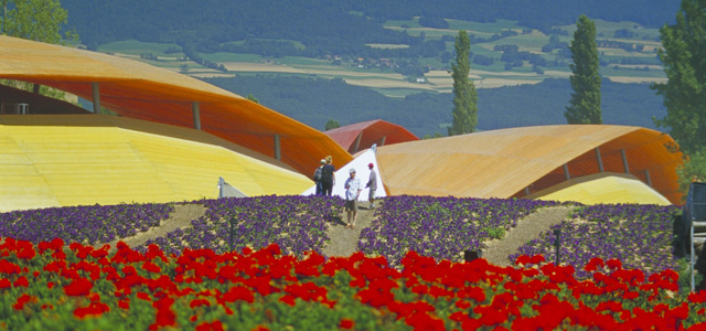 高達六米的人造沙丘狀小山是這次設(shè)計的主要元素,小山采用瑞士當(dāng)?shù)氐哪緲?gòu)技術(shù)堆砌,各種顏色鮮艷的鮮花被按照特定的圖形組合種植在上面,游人徜徉在這些小山之間,感受到的不僅的強烈的色彩給人帶來的視覺沖擊,更有濃烈的花香刺激你的嗅覺神經(jīng)。