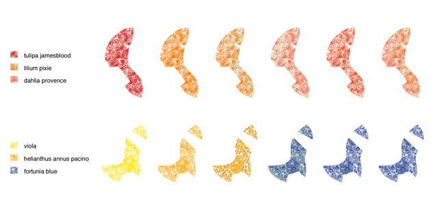 展館及各種附屬設施被布置在這些人工沙丘的旁邊,展館表面覆蓋有半透明的人造皮革材料,頂棚則以泡沫噴涂出各種花朵圖案來標識各個展館的展示功能,讓游人通過圖案就可以明了展館中的植物種類。