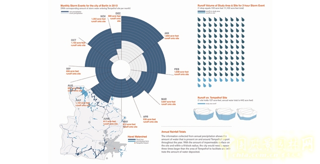 滕珀爾霍夫機場的地形通過這個設(shè)計的高低點控制將雨水收集、減緩和流動到六個區(qū)域。最終,這些水通過當(dāng)?shù)囟喾N四季植物的過濾形成了一個低水位干凈的、天熱式的游泳池。這個地形的演變也可以作為滑雪、溜冰的場所。
