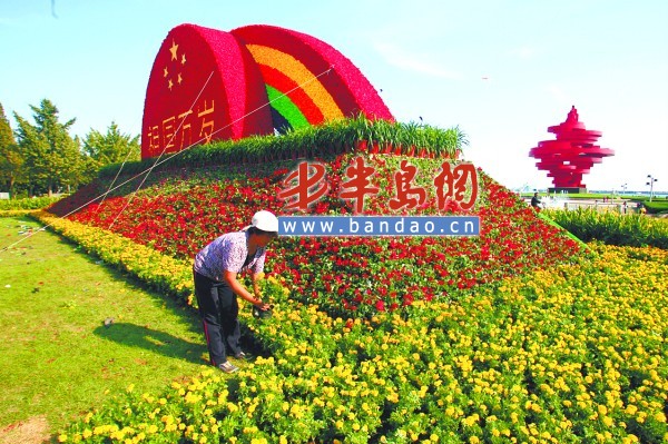 9月27日下午,五四廣場靠近東海路一側的空地上矗立起了一座“青山綠水”為主題的國慶節花卉組擺,組擺總長24米,高約6米,由一串紅、萬壽菊和矮牽牛等8萬余盆時令花卉組成,營造出了喜慶祥和的節日氣氛。
