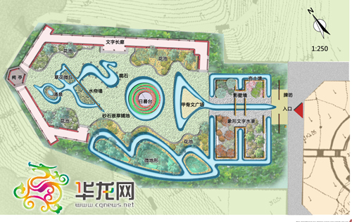 馮學(xué)軍告訴記者,安陽展園的設(shè)計(jì)結(jié)合地勢形狀,以“安陽園”三個(gè)字的甲骨文書法形體的組合形成空間布局結(jié)構(gòu)。在此布局結(jié)構(gòu)基礎(chǔ)上,賦予實(shí)質(zhì)性的建園內(nèi)容,如水、花、樹、道路、長廊、景墻等小品。