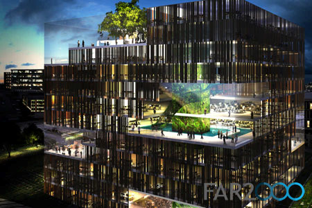 公共區域有會議室、餐廳、供人們休閑的平臺以及體育設施等。從中庭可以進入到整個辦公區域,中庭成為員工交流的場所。立面與中庭之間有著“綠色緩沖帶”,供建筑“呼吸”之用。建筑的環保原則——緊湊布局、自然通風、雙層立面和熱介質等都與綠色緩沖帶結合起來。