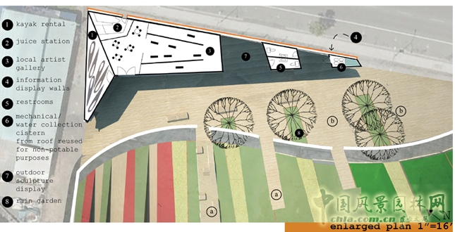 設計的“船舫”是作為一種新的文化和教育的環境中心,包括咖啡廳、獨木舟出租場地、聚會廳及室內外畫廊。