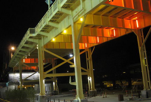 為了營造一個(gè)溫馨的的城市居住空間,燈光工程公司為座位區(qū)、人行道和廣場(chǎng)設(shè)計(jì)了照明燈景。對(duì)于這個(gè)空間的“天花板”,鐵橋下方加強(qiáng)了浮動(dòng)效果的投光燈,勾勒和照亮了I型表面和鉚釘紋理。紅色和金色的雙色配色方案與淡黃色的油漆涂料搭配和諧。