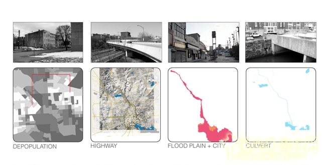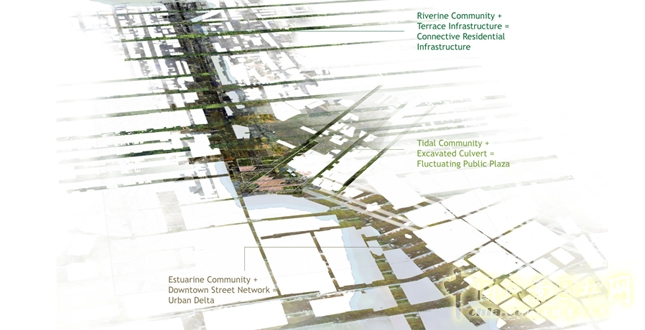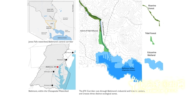 中國風(fēng)景園林網(wǎng)訊 巴爾的摩是美國大西洋沿岸重要的海港城市,它位于切薩皮克灣頂端的西側(cè),巴爾的摩市以豐富的工業(yè)歷史扎根于河流三角洲。瓊斯瀑布是流經(jīng)這個城市的河流之一,并且橫跨巴爾的摩市的住宅區(qū)和工業(yè)區(qū)。巴爾的摩經(jīng)歷了很長的戰(zhàn)亂,使得城市中心的很大一部分處于百廢待興的狀態(tài)。而大部分這些區(qū)域又緊鄰瓊斯瀑布港灣,很多建筑還受到了洪水的沖刷。該項目設(shè)計了一系列濕地梯田生態(tài)景觀。這些梯田擴(kuò)展到鄰近區(qū)域的河流走廊,從而達(dá)到控制雨水的作用。