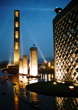 城之西北古堰雄姿,群山環峙;東南平疇萬里,千頃良田。其水由西北向東南匯百川、澤沃野,奔騰呼嘯,氣勢磅礴,形成放射狀的水網,奠定了天府之國扇形文化景觀的基礎格局,是政治、經濟和文化發展之所依賴。而都江堰正是扇面的起點,廣場則為都江堰的扇面核心。