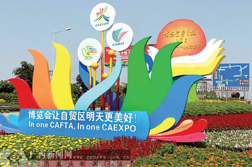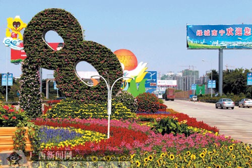 壯錦大道綠化帶上,用鮮花組成的第八屆中國-東盟博覽會“8”字特別引人注目
